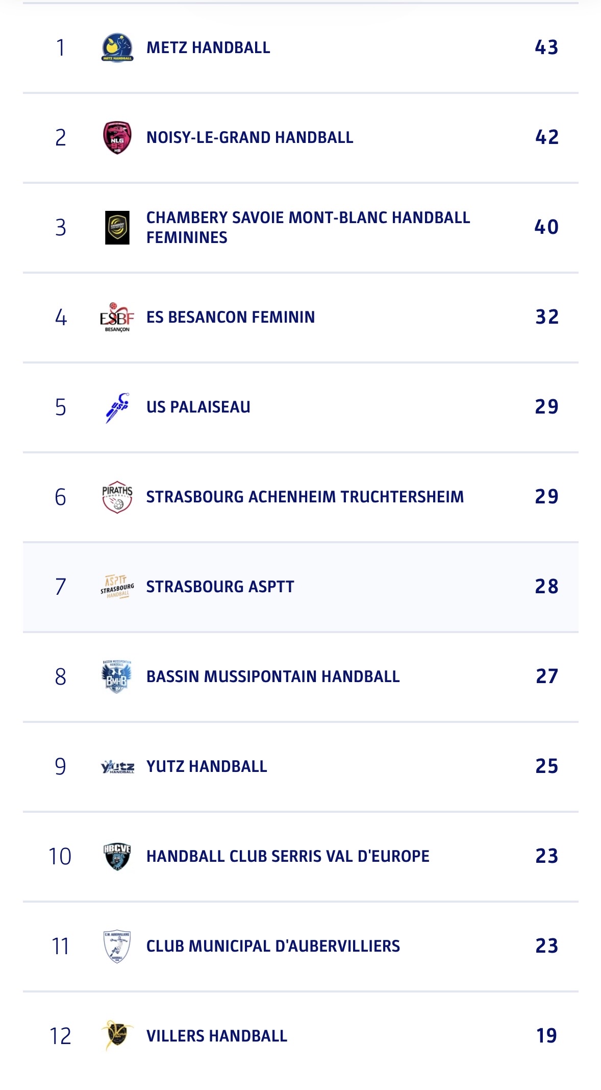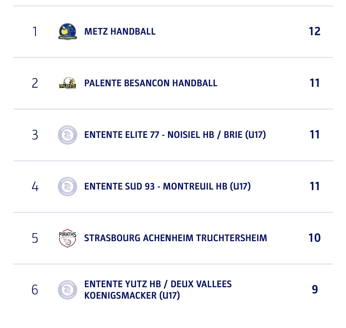 Classement U17 (poule haute)